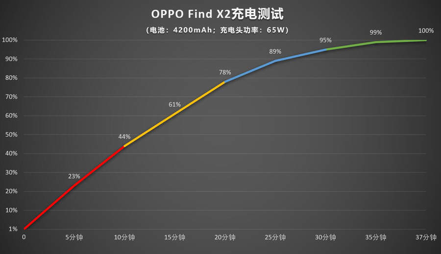充电方面,电池电量剩余1%的时候开始充电。5分钟即可达到23%的电量,10分钟就能达到44%的电量,30分钟即可达到95%的电量,最终达到100%的电量只需37分钟,整体充电速度非常快。